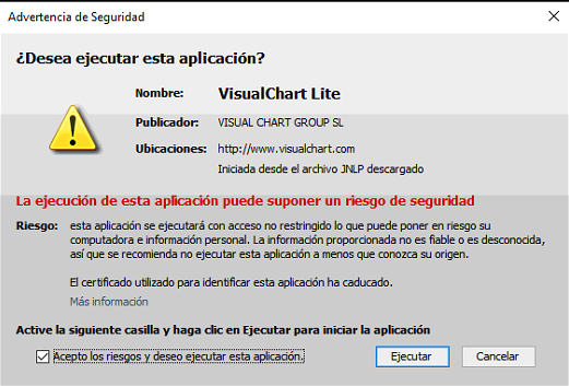 Cada vez que ejecute Visual Chart Lite, deberá marcar la opción "Acepto los riesgos y deseo ejecutar esta aplicación", tal y como puede observar en la siguiente imagen: